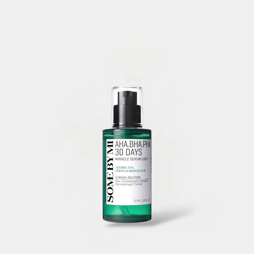 SOME BY MI AHA, BHA, PHA 30 Days Miracle Serum Light is a fast-absorbing, non-oily formula for problem skin, featuring gentle exfoliants (AHA, BHA, PHA) to clear pores and smooth texture, plus high concentrations of Tea Tree (73%) and Centella Asiatica (15%) to soothe redness, calm irritation, control sebum, and strengthen the skin barrier, promoting brighter, clearer, and more hydrated skin in about 30 days. It's designed for acne-prone and sensitive skin, offering dual benefits for brightening and anti-wrinkle care with natural, soothing ingredients like Mugwort and Panthenol. .